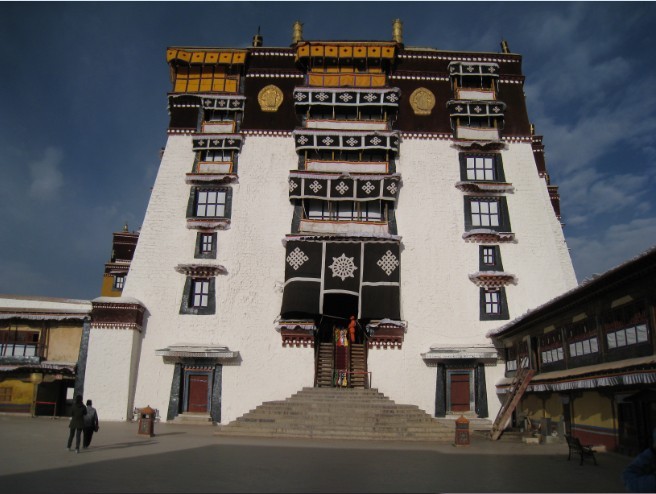 雄偉壯麗的布達(dá)拉宮矗立在拉薩市的紅山上,依山壘砌巍峨壯觀氣勢雄渾,像巨人一樣俯視著蕓蕓眾生。她起基于紅山南邊的山腰,依山勢修筑到山頂,基本上覆蓋了整個紅山,其充分運動建筑的體量、形制、質(zhì)感、比例、結(jié)構(gòu)和色彩等,塑出獨特的建筑藝術(shù)形象。其總平面布局不強調(diào)均衡對象,而是充分利用地形和空間,層層套接,錯綜復(fù)雜,追求建立縱向延伸的空間序列結(jié)構(gòu)。布達(dá)拉宮的情面、木構(gòu)和墻體的大面積涂色,成為建筑的一大亮點。總體外觀以紅、白兩色為主,交通設(shè)計院的多吉處長告訴我們,墻體上白色涂料中混合了牛奶和白糖,并且在每年藏歷新年時都要重新進行粉刷,其目的是保證布達(dá)拉宮外觀的整體美感始終如一。宮殿的外墻上還選取了一種特殊的桔梗材質(zhì)來進行堆砌,這種材質(zhì)不僅不易腐蝕,更具有防震、易于運輸、重量輕的優(yōu)點。